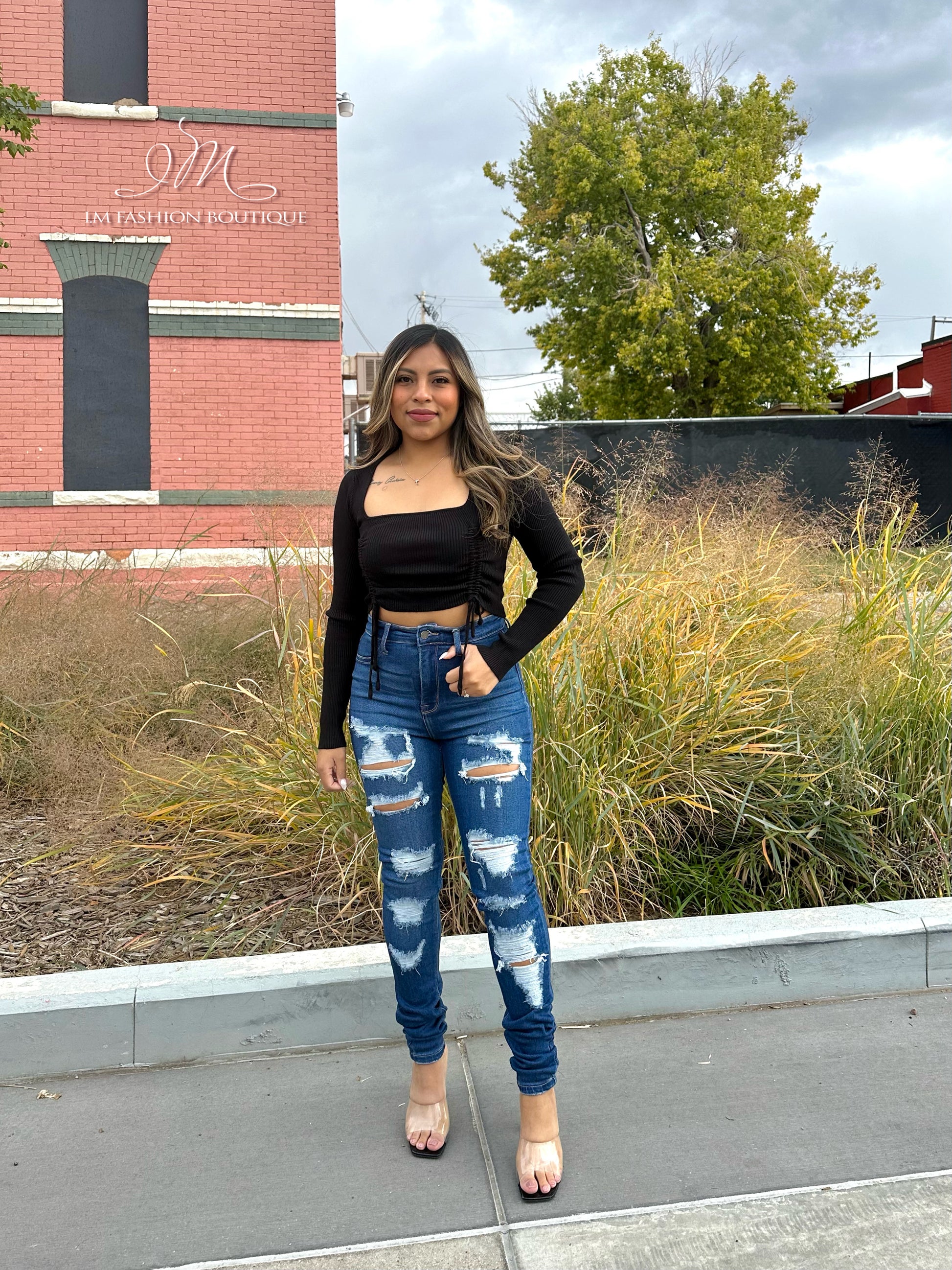 The Ellie Top provides optimal warmth and comfort with its long sleeves and thick rib knit fabric. Its ruched detail in front adds a unique touch, making it the perfect top for any occasion.
