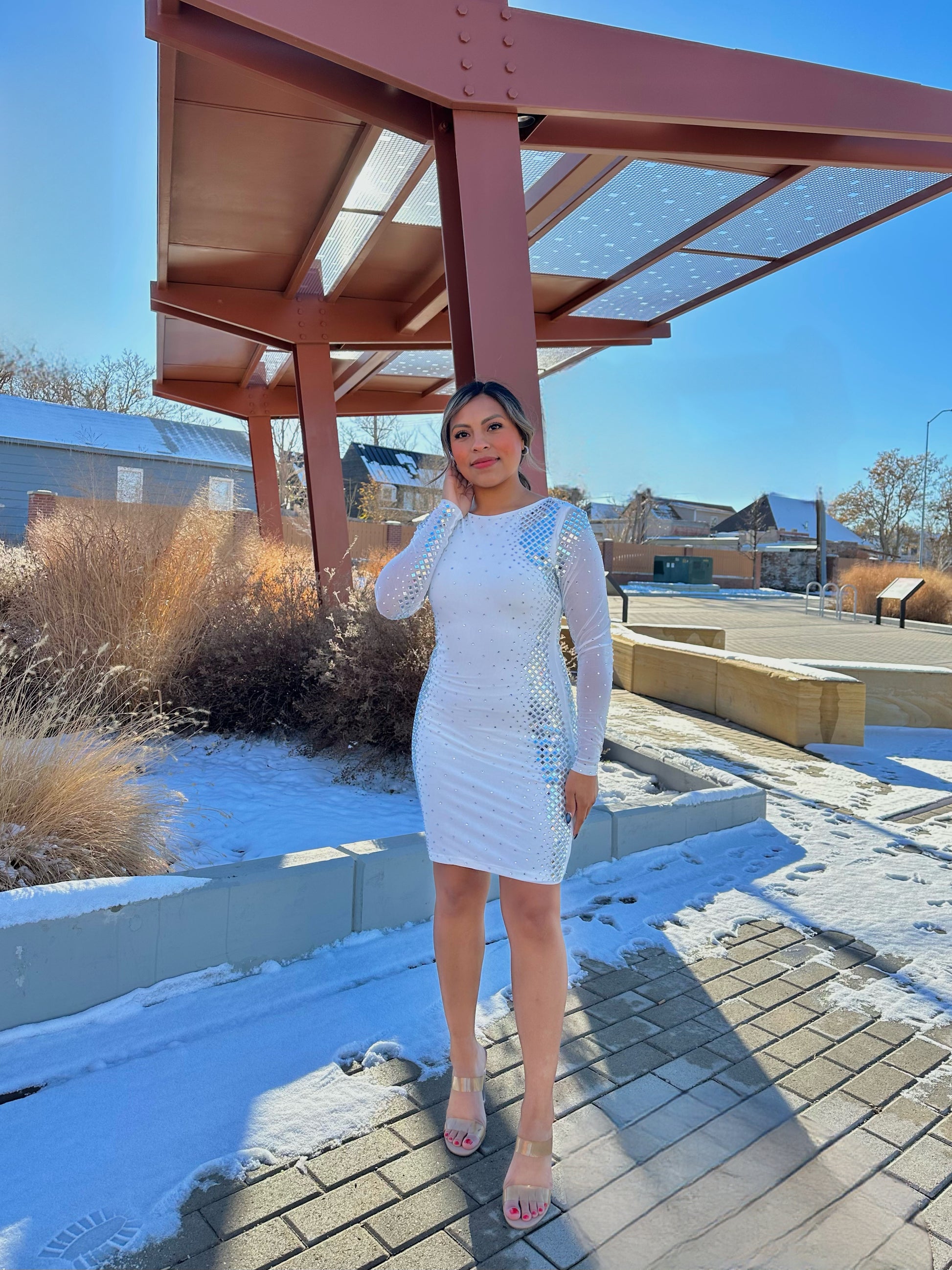 The Yvette Mini Dress is the perfect holiday outfit! Crafted from square and rhinestone mesh with sheer long sleeves and a round neck, this Ivory mini dress is sure to make a statement. Perfect for your special occasion.